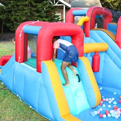 underholdning med rutsjebaner, klatrevæg, forhindringer og legeområde – perfekt til både fødselsdage, sommerfester og leg i hverdagen.