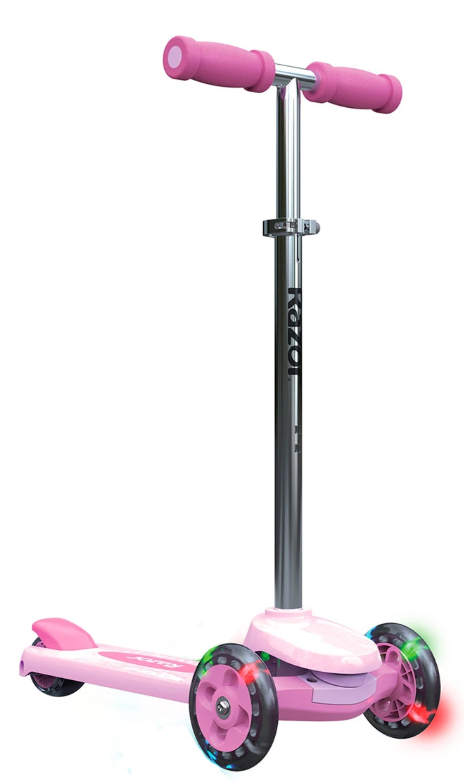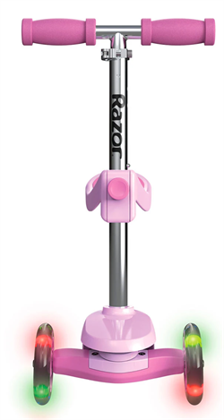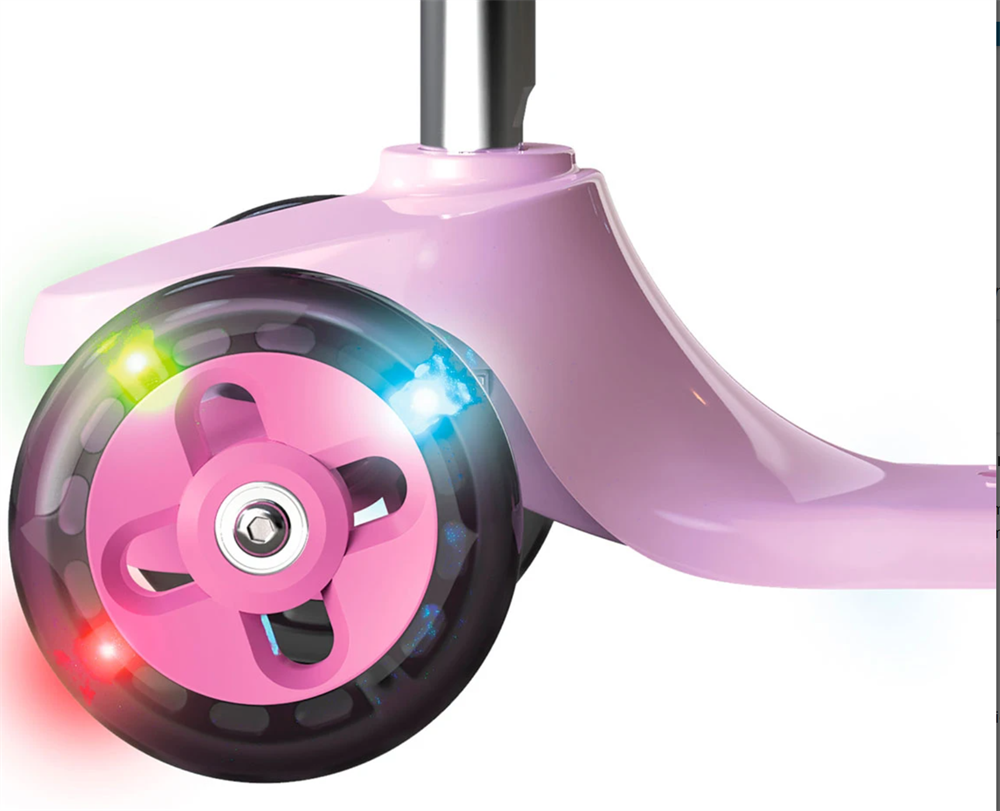 Den stabile trehjulede konstruktion gør den let at styre og svær at vælte, hvilket giver en tryg og sjov køreoplevelse. De farverige LED-lys i forhjulene og på dækket lyser op, når scooteren er i bevægelse, og slukker automatisk efter 30 sekunders stilstand for at spare på batteriet.